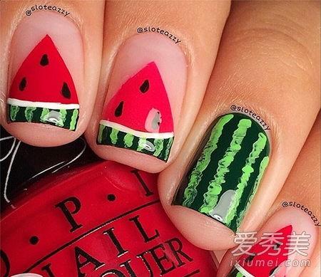 3. 瓜肉指甲:这种美甲款式则模仿的是瓜肉的颜色,通常是用浅绿色指甲油涂满指甲,再在指甲上画出瓜肉的纹理。